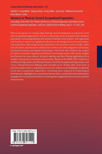 This book reports on cutting-edge findings and developments in physical, social and occupational ergonomics. It covers a broad spectrum of studies and evaluation procedures concerning physical and mental workload, work posture and ergonomic risk. Further, it reports on significant advances in the design of services and systems, including those addressing special populations, for purposes such as health, safety and education, and discusses solutions for a better and safer integration of humans, automated systems and digital technologies. The book also analyzes the impact of culture on people's cognition and behavior, providing readers with timely insights into theories on cross-cultural decision-making, and their diverse applications for a number of purposes in businesses and societies. Based on the AHFE 2021 conferences on Physical Ergonomics and Human Factors, Social & Occupational Ergonomics, and Cross-Cultural Decision Making, held virtually on 25-29 July, 2021, from USA,it provides readers with a comprehensive overview of the current challenges in physical, social and occupational ergonomics, including those imposed by technological developments, highlights key connections between them, and puts forward optimization strategies for sociotechnical systems, including their organizational structures, policies and processes.