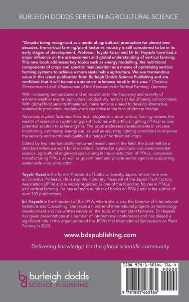 This collection reviews the wealth of research on vertical farms or plant factories with artificial lighting (PFALs). It summarises key research both on improving process efficiency and produce quality of horticultural crops such as fruit and vegetables, ornamentals and herbs.