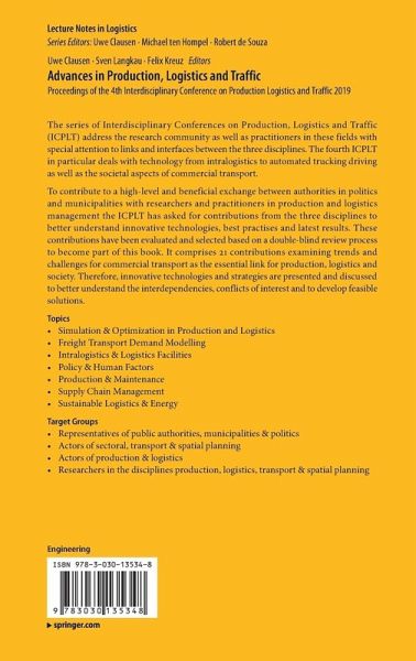To contribute to a high-level and beneficial exchange between authorities in politics and municipalities with researchers and practitioners in production and logistics management the ICPLT has asked for contributions from the three disciplines to better understand innovative technologies, best practises and latest results. These contributions have been evaluated and selected based on a double-blind review process to become part of this book. It comprises 21 contributions examining trends and challenges for commercial transport as the essential link for production, logistics andsociety. Therefore, innovative technologies and strategies are presented and discussed to better understand the interdependencies, conflicts of interest and to develop feasible solutions.