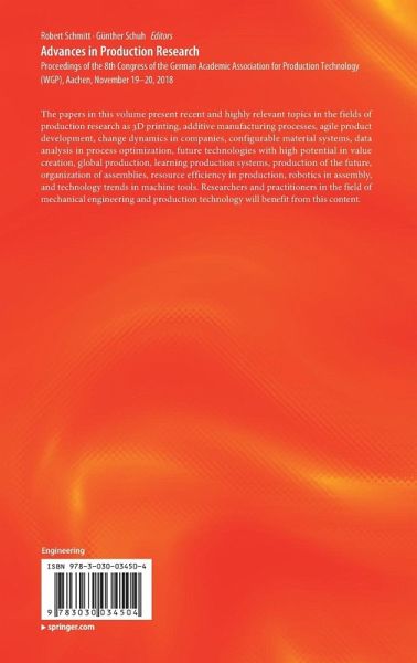 The papers in this volume present recent and highly relevant topics in the fields of production research as 3D printing, additive manufacturing processes, agile product development, change dynamics in companies, configurable material systems, data analysis in process optimization, future technologies with high potential in value creation, global production, learning production systems, production of the future, organization of assemblies, resource efficiency in production, robotics in assembly, and technology trends in machine tools. Researchers and practitioners in the field of mechanical engineering and production technology will benefit from this content.