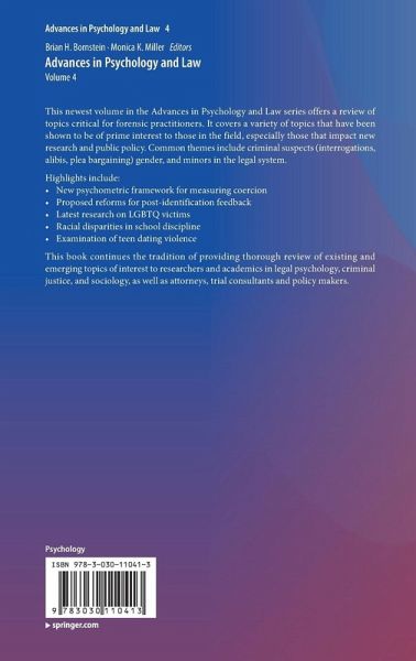 The present volume consists of up-to-date review articles on topics relevant to psychology and law, and will be of current interest to the field. Notably, the majority of these topics are currently attracting a great deal of research and public policy attention in the U.S. and elsewhere, as evidenced by programs at the American Psychology-Law Society and related conferences. Topics for the present volume include: attitudes toward the police (Cole et al.), alibis (Charman et al.), hate crimes based on gender and sexual orientation (Plumm & Leighton), the role of gender at trial (Livingston et al.), neuroimages in court (Glen), intimate partner violence (Mauer & Reppucci), post-identification feedback (Douglass & Smalarz) and individual differences in eyewitness identification (Snowden & Bornstein), veterans' wellbeing (Berthelot & Prager), and plea bargaining (Levett).