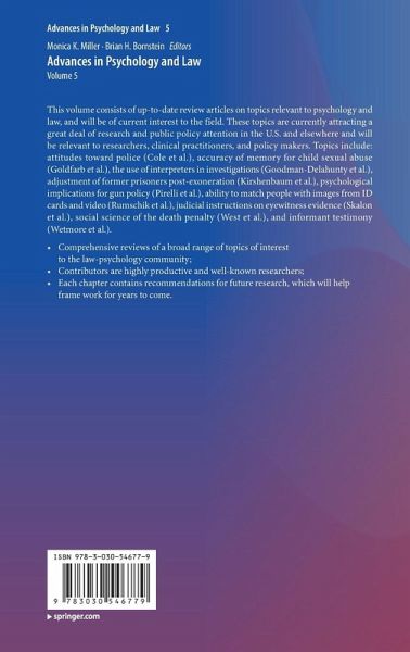 This volume consists of up-to-date review articles on topics relevant to psychology and law, and will be of current interest to the field. These topics are currently attracting a great deal of research and public policy attention in the U.S. and elsewhere and will be relevant to researchers, clinical practitioners, and policy makers. Topics include: attitudes toward police (Cole et al.), accuracy of memory for child sexual abuse (Goldfarb et al.), the use of interpreters in investigations (Goodman-Delahunty et al.), adjustment of former prisoners post-exoneration (Kirshenbaum et al.), psychological implications for gun policy (Pirelli et al.), ability to match people with images from ID cards and video (Rumschik et al.), judicial instructions on eyewitness evidence (Skalon et al.), social science of the death penalty (West et al.), and informant testimony (Wetmore et al.).