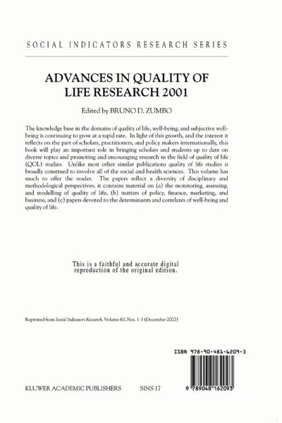The knowledge base in the domains of quality of life, well-being, and subjective well-being is continuing to grow at a rapid rate. In light of this growth, and the interest it reflects on the part of scholars, practitioners, and policy makers internationally, this book will play an important role in bringing scholars and students up to date on diverse topics and promoting and encouraging research in the field of quality-of-life (QOL) studies. Unlike most other similar publications quality of life studies is broadly construed to involve all of the social and health sciences. This volume has much to offer the reader. The papers reflect a diversity of disciplinary and methodological perspectives, it contains material on (a) the monitoring, assessing, and modelling of quality of life, (b) matters of policy, finance, marketing, and business, and (c) papers devoted to the determinants and correlates of well-being and quality of life.