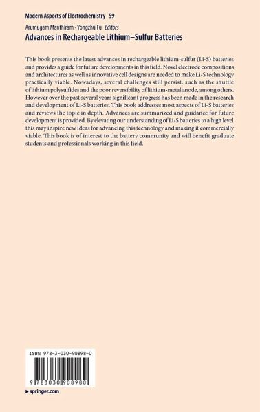 Principles and Challenges of Li-S Batteries.- Sulfur-carbon Composite Cathodes.- Li2S Cathode in lithium-sulfur batteries.- Physical and Chemical Adsorption of Polysulfides.- Catalysis of Polysulfides.- Lithium Metal and Other Anodes.- Organosulfide and Polysulfide Cathodes.- Sulfur-containing Polymer Cathode Materials for Li-S batteries.- Advanced Characterization Techniques and Mechanistic Understanding.- Computation and Simulation.