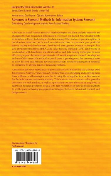 Advances in Research Methods for Information Systems Research: Data Mining, Data Envelopment Analysis, Value Focused Thinking focuses on bridging and unifying these three different methodologies in order to bring them together in a unified volume for the information systems community. This book serves as a resource that provides overviews on each method, as well as applications on how they can be employed to address IS research problems. Its goal is to help researchers in their continuous efforts to set the pace for having an appropriate interplay between behavioral research and design science.