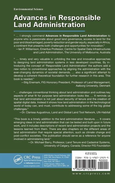 Toward Responsible Land Administration. Pro-Poor Land Administration. Land Administration for Food Security. Urbanization, Land Administration, and Good-Enough Governance. Land Administration for Post-Conflict Contexts. Land Administration Crowds, Clouds and the State. Point Cadastre. Digital Pen Method. Accelerated Land Administration Updates. Toward Fit-for-Purpose Land Consolidation. Dynamic Nomadic Cadastres. Land Administration Impacts on Land Use Change. Environmental Protection via Land Administration. Displacement and Land Administration. Social Tenure Domain Model: An Emerging Land Governance Tool. Future Directions in Responsible Land Administration.