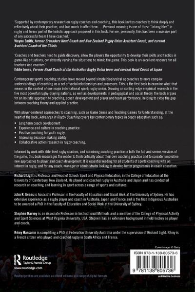 Richard Light is Professor and Head of School: Sport and Physical Education, in the College of Education at the University of Canterbury, New Zealand. He played and coached rugby in Australia and Japan and has conducted research on coaching and learning in sport across a range of sports and cultures John R. Evans is Associate Professor in the Faculty of Education and Social Work at the University of Sydney. He has extensive experience as a rugby player and coach in Australia, Japan and France and is the first Indigenous Australian to be awarded a PhD in the Faculty of Education and Social Work at the University of Sydney Stephen Harvey is an Associate Professor in Instructional Methods and a member of Physical Activity and Sport Sciences at West Virginia University, USA. Stephen has an extensive background in field hockey as player and coach and, before moving to the USA from the UK, was a National Governing Body coach educator and active field hockey coach, coaching with the England U16 Boys Rémy Hassanin is completing a PhD at Federation University Australia under the supervision of Richard Light. Rémy is a French citizen who played and coached rugby in South Africa and France
