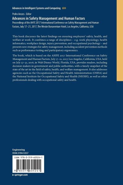 The book, which is based on the AHFE 2017 International Conference on Safety Management and Human Factors, held on July 17-21, 2017, in Los Angeles, California, USA, provides readers, including decision makers, professional ergonomists and program managers in government and public authorities, with a timely snapshot of the state of the art in the field of safety, health, and welfare management. It also addresses agencies such as the Occupational Safety and Health Administration (OSHA) and the National Institute for Occupational Safety and Health (NIOSH), as well asother professionals dealing with occupational safety and health.