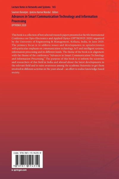 This book is a collection of best selected research papers presented at the 6th International Conference on Opto-Electronics and Applied Optics (OPTRONIX 2020) organized by the University of Engineering & Management, Kolkata, India, in June 2020. The primary focus is to address issues and developments in optoelectronics with particular emphasis on communication technology, IoT and intelligent systems, information processing and its different kinds. The theme of the book is in alignment with the theme of the conference "Advances in Smart Communication Technology and Information Processing." The purpose of this book is to inform the scientists and researchers of this field in India and abroad about the latest developments in the relevant field and to raise awareness among the academic fraternity to get them involved in different activities in the years ahead - an effort to realize knowledge-based society.