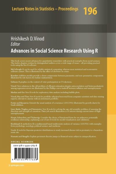 In the introduction of Advances in social Science Research Using R, the editor gives valuable short summaries of all chapters to point out that each one is of relevance beyond the scope of the disciplines where the methods or authors originate Several chapters are well suited for social scientists interested in new methodology and how to use it in R. These chapters not only introduce advanced statistical techniques, but also walk the reader through their usage in R in a concise and yet instructive way Other chapters show that complex econometric research questions can be addressed with R and illustrate the variety of advanced methods now available . (Journal of Statistical Software, Vol. 34, Book Review 2, April 2010)