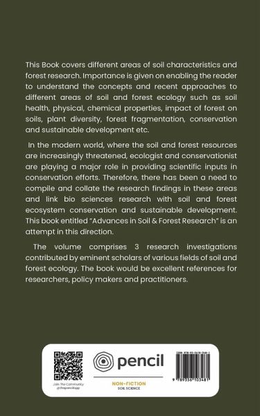 This Book covers different areas of soil characteristics and forest research. Importance is given on enabling the reader to understand the concepts and recent approaches to different areas of soil and forest ecology such as soil health, physical, chemical properties, impact of forest on soils, plant diversity, forest fragmentation, conservation and sustainable development etc. In the modern world, where the soil and forest resources are increasingly threatened, ecologist and conservationist are playing a major role in providing scientific inputs in conservation efforts. Therefore, there has been a need to compile and collate the research findings in these areas and link bio sciences research with soil and forest ecosystem conservation and sustainable development. This book entitled "Advances in Soil & Forest Research" is an attempt in this direction. The volume comprises 3 research investigations contributed by eminent scholars of various fields of soil and forest ecology. The book would be excellent references for researchers, policy makers and practitioners.