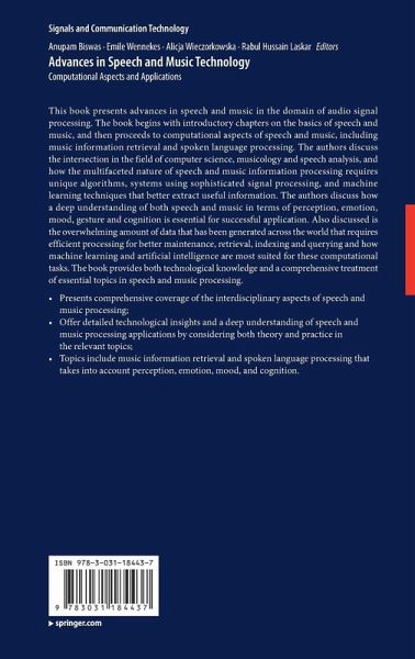 This book presents advances in speech and music in the domain of audio signal processing. The book begins with introductory chapters on the basics of speech and music, and then proceeds to computational aspects of speech and music, including music information retrieval and spoken language processing. The authors discuss the intersection in the field of computer science, musicology and speech analysis, and how the multifaceted nature of speech and music information processing requires unique algorithms, systems using sophisticated signal processing, and machine learning techniques that better extract useful information. The authors discuss how a deep understanding of both speech and music in terms of perception, emotion, mood, gesture and cognition is essential for successful application. Also discussed is the overwhelming amount of data that has been generated across the world that requires efficient processing for better maintenance, retrieval, indexing and querying and how machine learning and artificial intelligence are most suited for these computational tasks. The book provides both technological knowledge and a comprehensive treatment of essential topics in speech and music processing.
