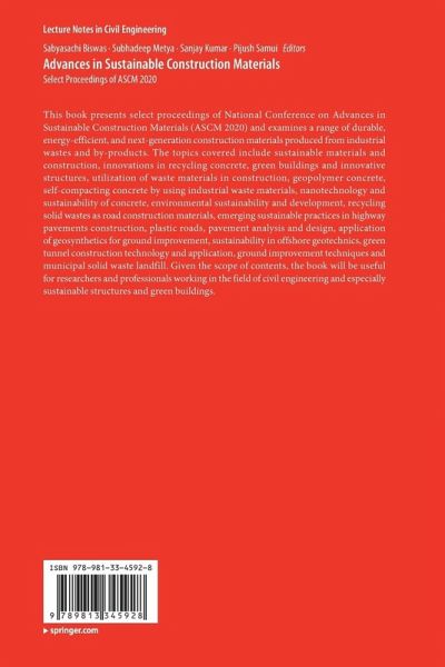 This book presents select proceedings of National Conference on Advances in Sustainable Construction Materials (ASCM 2020) and examines a range of durable, energy-efficient, and next-generation construction materials produced from industrial wastes and by-products. The topics covered include sustainable materials and construction, innovations in recycling concrete, green buildings and innovative structures, utilization of waste materials in construction, geopolymer concrete, self-compacting concrete by using industrial waste materials, nanotechnology and sustainability of concrete, environmental sustainability and development, recycling solid wastes as road construction materials, emerging sustainable practices in highway pavements construction, plastic roads, pavement analysis and design, application of geosynthetics for ground improvement, sustainability in offshore geotechnics, green tunnel construction technology and application, ground improvement techniques and municipal solidwaste landfill. Given the scope of contents, the book will be useful for researchers and professionals working in the field of civil engineering and especially sustainable structures and green buildings.