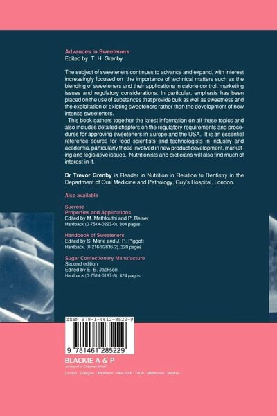 1 Molecular structure and sweet taste.- 1.1 Introduction.- 1.2 Development of structure-taste theories.- 1.3 Classes of sweeteners.- References.- Further reading.- 2 Essential information on regulatory and legislative matters pertaining to sweeteners in the United Kingdom and the European Union.- 2.1 Current legislative position of sweeteners.- 2.2 The EU Sweeteners Directive.- 2.3 Implementation of the directive in United Kingdom law.- 2.4 Amendment of the Sweeteners Directive.- 2.5 Procedures for the addition of new sweeteners to the permitted list.- 2.6 Conclusions.- 3 Regulatory processes for new sweeteners in the United States of America.- 3.1 FDA's responsibilities versus resources.- 3.2 Regulatory strategy for a food additive petition.- 3.3 Generating data for a food additive petition.- 3.4 Mechanics of a food additive petition.- 3.5 The petition review and approval process.- 3.6 Conclusion.- References.- 4 Physiological properties of polyols in comparison with easily metabolisable saccharides.- Summary.- 4.1 Introduction.- 4.2 Digestion.- 4.3 Absorption of polyols.- 4.4 Postprandial effects of polyols on blood glucose and polyol concentrations.- 4.5 Microbial utilisation of undigested and unabsorbed polyols in the colon.- 4.6 Gastrointestinal tolerance.- 4.7 Caloric utilisation of polyols.- 4.8 Dental health related aspects of polyols.- 4.9 Conclusions.- References.- 5 Versatility of maltitol in different forms as a sugar substitute.- 5.1 Introduction.- 5.2 Properties.- 5.3 Commercial forms of maltitol.- 5.4 Applications.- 5.5 Conclusion.- 6 Basic structure and metabolism of isomalt.- Summary.- 6.1 Introduction.- 6.2 Production of isomalt.- 6.3 General physico-chemical characteristics of isomalt.- 6.4 Metabolism of isomalt.- 6.5 Digestion and absorption ofisomalt.- 6.6 Isomalt: a bulk sweetener for diabetics.- 6.7 Energetic aspects: isomalt as a sweetener for calorie-reduced foods.- 6.8 Conclusions.- References.- 7 Properties and applications of isomalt and other bulk sweeteners.- 7.1 Introduction.- 7.2 Manufacturing processes of mono- and disaccharide alcohols.- 7.3 Safety aspects.- 7.4 Overview of bulk sweeteners.- 7.5 Sensorial properties.- 7.6 Market acceptance.- References.- 8 Nutritional properties and applications of erythritol: a unique combination?.- 8.1 Introduction.- 8.2 Chemical and physical properties.- 8.3 Erythritol, a naturally occurring substance.- 8.4 An entirely biotechnological process.- 8.5 Nutritional properties.- 8.6 Functional properties of erythritol.- 8.7 Food a pplications of erythritol.- 8.8 Conclusions.- Reference.- 9 Sweet taste and solution properties of ?,?-trehalose as a new cryoprotectant sugar.- 9.1 Introduction.- 9.2 Carbohydrates as cryoprotectants.- 9.3 Mechanism of cryoprotection.- 9.4 Physico-chemical properties of ?,?-trehalose in aqueous solution.- 9.5 Interpretation of interactions of ?,?-trehalose with water.- 9.6 Intensity/time relationships of ?,?-trehalose: relation of its physico-chemical properties to its sweet taste.- 9.7 Protective effect of ?,?-trehalose in freeze-dried fruit purées.- 9.8 Conclusion.- Acknowledgement.- References.- 10 Intense sweeteners and calorie control: the weight of a body of evidence.- 10.1 Introduction.- 10.2 The original observations.- 10.3 Recent studies on the effects of intense sweeteners.- 10.4 Conclusions.- References.- 11 Features of alitame(TM) as a new high intensity sweetener.- 11.1 Introduction.- 11.2 Development rationale.- 11.3 Physical and chemical characteristics.- 11.4 Temporal profile - sweetness quality.- 11.5Synergism - admixture potential.- 11.6 Utility in food systems.- 11.7 Decomposition pathways.- 11.8 Metabolism.- 11.9 Safety.- 11.10 Regulatory status.- References.- 12 Neohesperidine dihydrochalcone: recent findings and technical advances.- 12.1 Introduction.- 12.1 Origin, production and related substances.- 12.3 Regulatory developments.- 12.4 Stability.- 12.5 Sensory properties.- 12.6 Product applications.- References.- 13 The uses and commercial development of sucralose.- 13.1 Introduction.- 13.2 Production.- 13.3 Regulatory situation.- 13.4 Conclusions.- References.- 14 The blending of sweeteners - Applications and safety issues.- 14.1 Introduction.- 14.2 Synergism.- 14.3 Sweetness stability.- 14.4 Selection criteria.- 14.5 Safety.- 14.6 Intake considerations.- References.- 15 Cultural and legislative influences on the consumption of high intensity sweeteners in Europe.- 15.1 Objectives.- 15.2 Scope.- 15.3 Background.- 15.4 Legislation.- 15.5 Soft drinks.- 15.6 Formulations.- 15.7 Conclusions.- References.