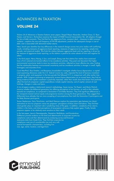 Introduction: The Role of Tax Researchers;John Hasseldine Market Response to Fin 48 Adoption: A Debt Covenant Theory;Raquel Meyer Alexander Andrew Gross G. Ryan Huston and Vernon J. Richardson Reconciling the conflicting results of prior research on the relation between aggressive book and tax reporting;Sarah Lyon Environmental uncertainty and Tax avoidance;Henry Huang Li Sun and Joseph Zhang The impact of Bonus depreciation on capital expenditures;Carol MacPhail Riza Emekter and Benjamas Jirasakuldech Generational differences in perceptions of tax fairness and attitudes towards compliance;Susan Jurney Tim Rupert and Marty Wartick Demand for tax preparation services: an exploratory examination of client vs. tax preparer expectation gaps;Teresa Stephenson Gary M. Fleischman and Mark Peterson Corporate income tax compliance costs: and their determinants: evidence from Greece; Ioannis Stamatopoulos Stamatina Hadjidema and Konstantinos Eleftheriou