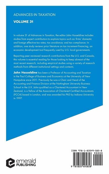 Volume 31 of Advances in Taxation includes studies from expert contributors, exploring topics such as: firmsâ domestic and foreign effective tax rates; tax avoidance; and tax compliance. A study reviews prior literature on tax increment financing, an economic development tool frequently used by U.S. local governments.