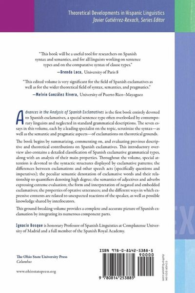 Advances in the Analysis of Spanish Exclamatives is the first book entirely devoted to Spanish exclamatives, a special sentence type often overlooked by contemporary linguists and neglected in standard grammatical descriptions. The seven essays in this volume, each by a leading specialist on the topic, scrutinize the syntax-as well as the semantic and pragmatic aspects-of exclamations on theoretical grounds. The book begins by summarizing, commenting on, and evaluating previous descriptive and theoretical contributions on Spanish exclamatives. This introductory overview also contains a detailed classification of Spanish exclamative grammatical types, along with an analysis of their main properties. Special attention is devoted in the book throughoutto the syntactic structures displayed by exclamative patterns; the differences between exclamations and other speech acts (specifically questions and imperatives); the peculiar semantic denotation of exclamative words and their relationship to quantifiers denoting high degree; the semantics of adjectives and adverbs expressing extreme evaluation; the form and interpretation of negated and embedded exclamatives; the properties of optative utterances; and the different ways in which expressive contents are related to unexpected reactions of the speaker, as well as possible knowledge shared by interlocutors. This groundbreaking volume provides a complete and accurate picture of Spanish exclamation by integrating its numerous component parts.