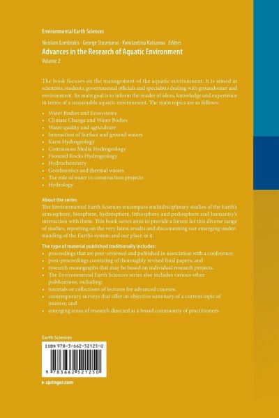 The book focuses on the management of the aquatic environment. It is aimed at scientists, students, governmental officials and specialists dealing with groundwater and environment. Its main goal is to inform the reader of ideas, knowledge and experience in terms of a sustainable aquatic environment. The main topics are as follows: Water Bodies and Ecosystems; Climate Change and Water Bodies; Water quality and agriculture; Interaction of Surface and ground waters; Karst Hydrogeology; Continuous Media Hydrogeology; Fissured Rocks Hydrogeology; Hydrochemistry; Geothermics and thermal waters; The role of water in construction projects; Hydrology