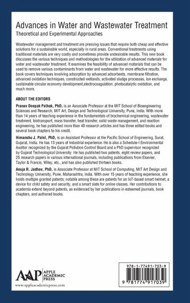 Pranav Deepak Pathak, PhD, is an Associate Professor at the MIT School of Bioengineering Sciences and Research, MIT Art, Design and Technological University, Pune, India. With more than 14 years of teaching experience in the fundamentals of biochemical engineering, wastewater treatment, biotransport, mass transfer, heat transfer, solid waste management, and reaction engineering, he has published more than 40 research articles and has three edited books and several book chapters to his credit. Himanshu J. Patel, PhD, is an Assistant Professor at the Pacific School of Engineering, Surat, Gujarat, India. He has 13 years of industrial experience. He is also a Schedule-I Environmental Auditor recognized by the Gujarat Pollution Control Board and a PhD supervisor recognized by Gujarat Technological University. He has published two patents, eight review papers, and 25 research papers in various international journals, including publications from Elsevier, Taylor & Francis, Wiley, etc., and has also published thirteen books. Anuja R. Jadhav, PhD, is Associate Professor at MIT School of Computing, MIT Art Design and Technology University, Pune, Maharashtra, India. With over 15 years of teaching experience, she holds multiple granted patents; notable among these are patents for an IoT-based smart helmet, a device for child safety and security, and a smart slate for online classes. Her contributions to academia extend beyond patents, as evidenced by her publications in esteemed journals, book chapters, and authored books.
