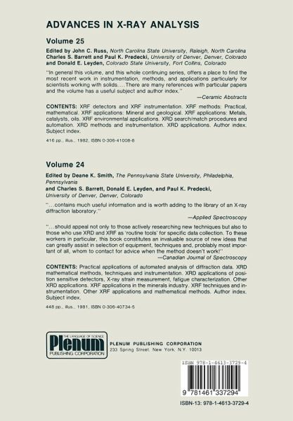 I. Accuracy in X-ray Powder Diffraction.- Accuracy in Angle and Intensity Measurements in X-Ray Powder Diffraction.- Precision Lattice Parameter Measurements with Guinier Camera and Counter Diffractometer: Comparison and Reconciliation of Results.- Effects of Diffractometer Alignment and Aberrations on Peak Positions and Intensities.- Accuracy and Precision of Intensities in X-Ray Polycrystalline Diffraction.- New Standard Reference Materials for X-Ray Powder Diffraction.- Precision and Reproducibility of Lattice Parameters from Guinier Powder Patterns: Follow-up and Assessment.- II. Search/Match Procedures, Powder Diffraction File.- POWDER-PATTERN: A System of Programs for Processing and Interpreting Powder Diffraction Data.- An Evaluation of Some Profile Models and the Optimization Procedures Used in Profile Fitting.- Computer-Aided Qualitative X-Ray Powder Diffraction Phase Analysis.- The JCPDS Data Base - Present and Future.- Search/Match Implications of the Frequency Distribution of "d" Values in the JCPDS Powder Data File.- Computer Search/Match of Standards Containing a Small Number of Reflections.- Comparison of the Hanawalt and Johnson-Vand Computer Search/Match Strategies.- III. Quantitative XRD Analysis.- A Comparison of Methods for Reducing Preferred Orientation.- The Dramatic Effect of Crystallite Size on X-Ray Intensities.- X-Ray Diffraction Intensity of Oxide Solid Solutions: Application to Qualitative and Quantitative Phase Analysis.- Quantitative Analys is of Platelike Pigments by X-Ray Diffraction.- Preparation and Certification of Standard Reference Materials to be Used in the Determination of Retained Austenite in Steels.- Profile Fitting for Quantitative Analysis in X-Ray Powder Diffraction.- XRD Quantitative Phase Analysis Using theNBS*QUANT82 System.- SCRIP - Fortran IV Software for Quantitative XRD.- IV. XRD Applications and Automation.- An X-Ray Diffraction Study of CaNi5 Hydrides Using In Situ Hydriding and Profile Fitting Methods.- The Measurement of Thermally Induced Structural Changes by High Temperature (900°C) Guinier X-Ray Powder Diffraction Techniques.- The Use of X-Ray Diffraction and Infrared Spectroscopy to Characterize Hazardous Wastes.- Comparison of X-Ray Powder Diffraction Techniques.- The Use of Multi-Scan Diffraction in Phase Identification.- An Automated X-Ray Diffractometer for Detection and Identification of Minor Phases.- Time Share Computer Capability for Phase Identification by X-Ray Diffraction.- V. X-Ray Stress Determination, Position Sensitive Detectors, Fatigue and Fracture Characterization.- The Use of Mn-K? X-Rays and a New Model of PSPC in Stress Analysis of Stainless Steel.- Measurement of Stress Gradients by X-Ray Diffraction.- A Method for X-Ray Stress Analysis of Thermochemically Treated Materials.- Application of a Position Sensitive Scintillation Detector for Nondestructive Residual Stress Measurements Inside Stainless Steel Piping.- On the X-Ray Diffraction Method of Measurement of Triaxial Stresses with Particular Reference to the Angle 2?o.- Direct Determination of Stress in a Thin Film Deposited on a Single-Crystal Substrate from an X-Ray Topographic Image.- The Determination of Elastic Constants Using a Combination of X-Ray Stress Techniques.- One-Dimensional, Curved, Position-Sensitive Detector for X-Ray Diffractometry.- A Phi-Psi-Diffractometer for Residual Stress Measurements.- X-Ray Fractography on Fatigue Fractured Surface.- X-Ray Diffraction Observation of Fracture Surfaces of Ductile Cast Iron.- Analytical and Experimental Investigation ofFlow and Fracture Mechanisms Induced by Indentation in Single Crystal MgO.- X-Ray Diffraction Study of Shape Memory in Uranium-Niobium Alloys.- VI. New XRF Instrumentation and Techniques.- X-Ray Fluorescence Analysis Using Synchrotron Radiation..- Energy Resolution Measurements of Mercuric Iodide Detectors Using a Cooled FET Preamplifier.- X-Ray Polarization: Bragg Diffraction and X-Ray Fluorescence.- A New Technique for Radioisotope-Excited X-Ray Fluorescence.- Bragg-Borrmann X-Ray Spectroscopy from a Line Source 341.- VII. XRF Computer Systems and Mathematical Corrections.- Automated Qualitative X-Ray Fluorescence Elemental Analysis.- A New Method for Quantitative X-Ray Fluorescence Analysis of Mixtures of Oxides or Other Compounds by Empirical Parameter Methods.- FPT: An Integrated Fundamental Parameters Program for Broadband EDXRF Analysis Without a Set of Similar Standards.- A Comparison of the XRF11 and EXACT Fundamental Parameters Programs When Using Filtered Direct and Secondary Target Excitation in EDXRF.- A Generalized Matrix Correction Approach for Energy- Dispersive X-Ray Fluorescence Analysis of Paint Using Fundamental Parameters and Scattered Silver K? Peaks.- Multielement Analysis of Unweighed Biological and Geological Samples Using Backscatter and Fundamental Parameters.- A Correction Method for Absorption in the Analysis of Aerosols by EDX Spectrometry.- XRF Analysis by Combining the Standard Addition Method with Matrix-Correction Models.- Accurate Geochemical Analysis of Samples of Unknown Composition.- VIII. XRF General Applications.- XRF Analysis of Vegetation Samples and Its Application to Mineral Exploration.- Application of XRF to Measure Strontium in Human Bone In Vivo.- Determination of Boron Oxide in Glass by X-Ray Fluorescence Analysis.-Measurement of Composition and Thickness for Single Layer Coating with Energy Dispersive XRF Analysis.- Determination of Light Elements on the Chem-X Multichannel Spectrometer.- Simultaneous Determination of 36 Elements by X-Ray Fluorescence Spectrometry as a Prospecting Tool.- Elemental Analysis of Geological Samples Using a Multichannel, Simultaneous X-Ray Spectrometer.- Chemical Analysis of Coal by Energy Dispersive X-Ray Fluorescence Utilizing Artificial Standards.- Author Index.