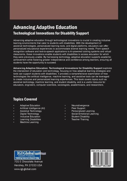 Advancing adaptive education through technological innovations is crucial in creating inclusive learning environments that cater to students with disabilities. With the development of assistive technologies, personalized learning tools, and digital platforms, educators can offer personalized educational experiences to accommodate diverse learning needs. From speech recognition software and text-to-speech applications to AI-powered tutoring systems and virtual classrooms, these innovations enable students with disabilities to access education for which they were previously unable. By harnessing technology, adaptive education supports academic achievement while fostering greater independence and confidence among learners, ensuring all students have the opportunity to succeed. Advancing Adaptive Education: Technological Innovations for Disability Support explores the intersection of education and technology, focusing on how adaptive learning strategies and tools can support students with disabilities. It provides a comprehensive examination of how technologies like artificial intelligence, machine learning, and assistive tools can be leveraged to create inclusive and personalized learning experiences. This book covers topics such as assistive technology, machine learning, and student disability, and is a useful resource for educators, engineers, computer scientists, sociologists, academicians, and researchers.
