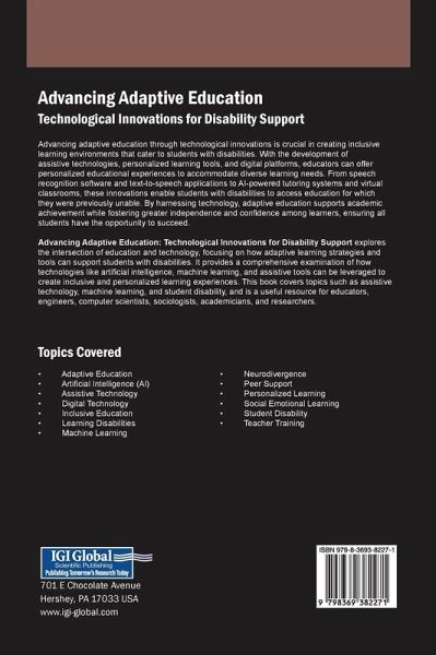 Advancing adaptive education through technological innovations is crucial in creating inclusive learning environments that cater to students with disabilities. With the development of assistive technologies, personalized learning tools, and digital platforms, educators can offer personalized educational experiences to accommodate diverse learning needs. From speech recognition software and text-to-speech applications to AI-powered tutoring systems and virtual classrooms, these innovations enable students with disabilities to access education for which they were previously unable. By harnessing technology, adaptive education supports academic achievement while fostering greater independence and confidence among learners, ensuring all students have the opportunity to succeed. Advancing Adaptive Education: Technological Innovations for Disability Support explores the intersection of education and technology, focusing on how adaptive learning strategies and tools can support students with disabilities. It provides a comprehensive examination of how technologies like artificial intelligence, machine learning, and assistive tools can be leveraged to create inclusive and personalized learning experiences. This book covers topics such as assistive technology, machine learning, and student disability, and is a useful resource for educators, engineers, computer scientists, sociologists, academicians, and researchers.
