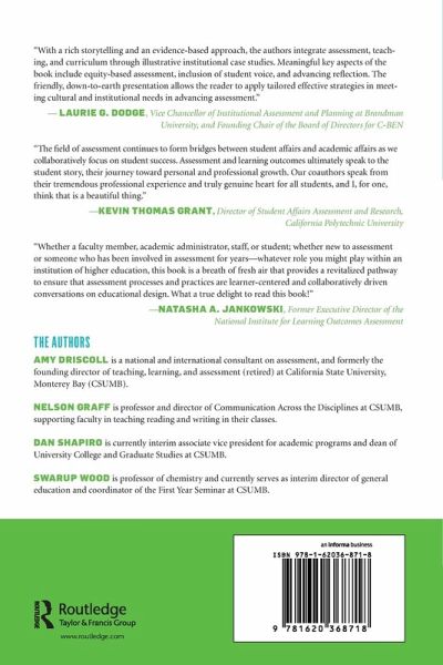Foreword Introduction 1. Advancing Assessment. Currents of Movement, Eddies, and New Paths-Amy Driscoll 2. Equity in Assessment. Supports for all Students-Amy Driscoll 3. Learning Outcomes. Engaging Students, Staff, and Faculty-Swarup Wood 4. Aligned and Coherent Assessment, Pedagogy, and Curriculum. Connections for Student Success-Amy Driscoll 5. Understanding and Supporting Achievement. Improving Assignment Prompts and Rubrics-Nelson Graff 6. Using Evidence of Student Achievement. Advancing Student Success-Amy Driscoll 7. Advancing Reflection. Fostering Conversations That Improve Student Success-Dan Shapiro 8. Advancing Communication. Sharing Stories That Improve Student Success-Dan Shapiro About the Authors Index