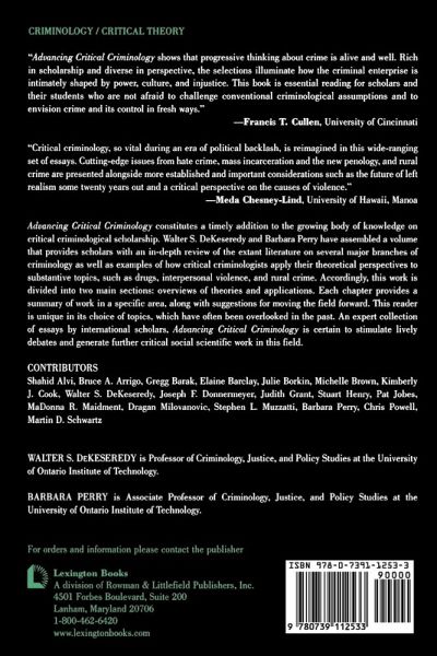 Advancing Critical Criminology constitutes a timely addition to the growing body of knowledge on critical criminology scholarship. DeKeseredy and Perry have assembled a volume that provides scholars with an in-depth review of the extant literature on several major branches of criminology as well as examples of how critical criminologists apply their theoretical perspectives to substantive topics, such as drugs, interpersonal violence, and rural crime.
