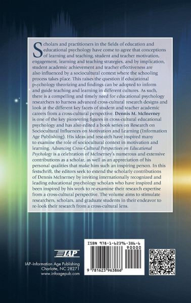 Scholars and practitioners in the fields of education and educational psychology have come to agree that conceptions of learning and teaching, student and teacher motivation, engagement, learning and teaching strategies, and by implication, student academic achievement and teacher effectiveness are also influenced by a sociocultural context where the schooling process takes place. This raises the question if educational psychology theorizing and findings can be adopted to inform and guide teaching and learning in different cultures. As such, there is a compelling and timely need for educational psychology researchers to harness advanced cross-cultural research designs and look at the different key facets of student and teacher academic careers from a cross-cultural perspective. Dennis McInerney is one of the key pioneering figures in cross-cultural educational psychology and has also edited a book series on Research on Sociocultural Influences on Motivation and Learning (Information Age Publishing). His ideas and research have inspired many to examine the role of sociocultural context in motivation and learning. This volume is a celebration of McInerney's numerous and extensive contributions as a scholar, as well as an appreciation of his personal qualities that make him such an inspiring person. In this festschrift, the editors seek to extend the scholarly contributions of Dennis McInerney by inviting internationally recognized and leading educational psychology scholars who have inspired and been inspired by his work to re-examine their research expertise from a cross-cultural perspective. The volume aims to stimulate researchers, scholars, and graduate students in their endeavor to re-look their research from a cross-cultural lens.