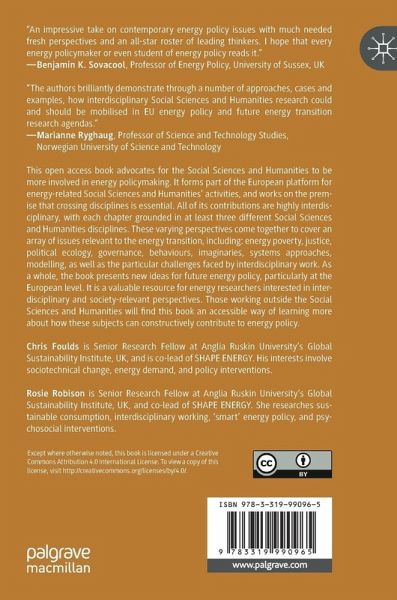 This open access book advocates for the Social Sciences and Humanities to be more involved in energy policymaking. It forms part of the European platform for energy-related Social Sciences and Humanities' activities, and works on the premise that crossing disciplines is essential. All of its contributions are highly interdisciplinary, with each chapter grounded in at least three different Social Sciences and Humanities disciplines. These varying perspectives come together to cover an array of issues relevant to the energy transition, including: energy poverty, justice, political ecology, governance, behaviours, imaginaries, systems approaches, modelling, as well as the particular challenges faced by interdisciplinary work. As a whole, the book presents new ideas for future energy policy, particularly at the European level. It is a valuable resource for energy researchers interested in interdisciplinary and society-relevant perspectives. Those working outside the Social Sciences and Humanities will find this book an accessible way of learning more about how these subjects can constructively contribute to energy policy.