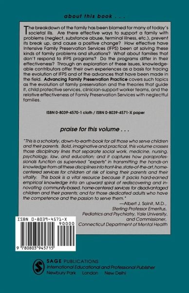 Are there effective ways to support a family with problems (for example, neglect, abuse, HIV, terminal illness) in order to prevent it breaking up, and make a positive change possible? This book examines Intensive Family Preservation Services, tracing the history of these services, their success at solving family problems, how families respond to the services and how their effectiveness varies according to the type of problem a family is experiencing. Through an exploration of these issues, the contributors offer their own experience as a basis for tracing the evolution of IFPS and the advances that have been made in the field.