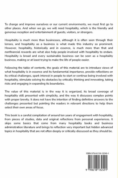 To change and improve ourselves or our current environments, we must first go to other places. And when we go, we will need hospitality, which is the friendly and generous reception and entertainment of guests, visitors, or strangers. Hospitality is much more than businesses, although it is often seen through their lenses, and hospitality as a business is what made the industry so prominent. However, hospitality, historically and in essence, is much more than that and nonfinancial rewards are what also help people involved with hospitality to endure. Hospitality is broad and every sustainable business can be seen as a hospitality business, making or at least trying to make the life of people easier. Following the table of contents, the goals of this material are to introduce views of what hospitality is in essence and its fundamental importance, provide reflections on its critical challenges, spark interest in people to start or continue being involved with hospitality, stimulate solving its obstacles by critically thinking and innovating, taking risks and engaging in expanding its boundaries. The value of this material is in the way it is organized, its broad coverage of hospitality still presented with simplicity, and the way it discusses complex points with proper brevity. It does not have the intention of finding definitive answers to the challenges presented but pointing the readers in relevant directions to help them select their own areas of focus. This book is a careful compilation of around ten years of engagement with hospitality, from pieces of studies, data and original reflections from personal experiences. It skips some basics that come from many hospitality books and business administration literature and brings to reflection very important but hidden advanced topics in hospitality that are not often deeply or critically discussed as they should be.