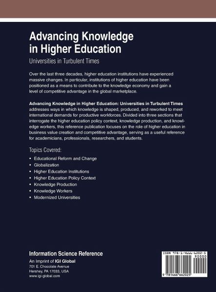 Over the last three decades, higher education institutions have experienced massive changes. In particular, institutions of higher education have been positioned as a means to contribute to the knowledge economy and gain a level of competitive advantage in the global marketplace. Advancing Knowledge in Higher Education: Universities in Turbulent Times addresses ways in which knowledge is shaped, produced, and reworked to meet international demands for productive workforces. Divided into three sections that interrogate the higher education policy context, knowledge production, and knowledge workers, this reference publication focuses on the role of higher education in business value creation and competitive advantage, serving as a useful reference for academicians, professionals, researchers, and students.