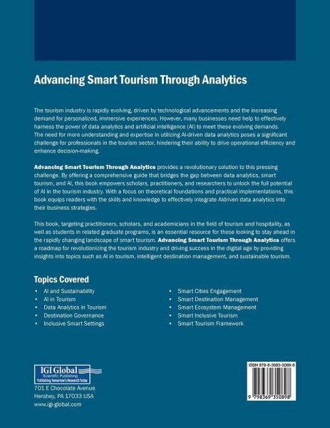 The tourism industry is rapidly evolving, driven by technological advancements and the increasing demand for personalized, immersive experiences. However, many businesses need help to effectively harness the power of data analytics and artificial intelligence (AI) to meet these evolving demands. The need for more understanding and expertise in utilizing AI-driven data analytics poses a significant challenge for professionals in the tourism sector, hindering their ability to drive operational efficiency and enhance decision-making. Advancing Smart Tourism Through Analytics provides a revolutionary solution to this pressing challenge. By offering a comprehensive guide that bridges the gap between data analytics, smart tourism, and AI, this book empowers scholars, practitioners, and researchers to unlock the full potential of AI in the tourism industry. With a focus on theoretical foundations and practical implementations, this book equips readers with the skills and knowledge to effectively integrate AI-driven data analytics into their business strategies.