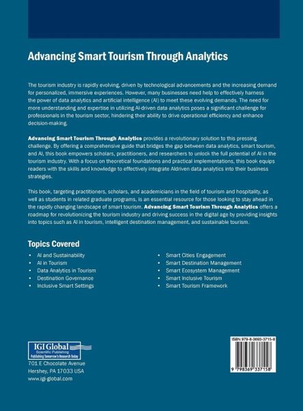 The tourism industry is rapidly evolving, driven by technological advancements and the increasing demand for personalized, immersive experiences. However, many businesses need help to effectively harness the power of data analytics and artificial intelligence (AI) to meet these evolving demands. The need for more understanding and expertise in utilizing AI-driven data analytics poses a significant challenge for professionals in the tourism sector, hindering their ability to drive operational efficiency and enhance decision-making. Advancing Smart Tourism Through Analytics provides a revolutionary solution to this pressing challenge. By offering a comprehensive guide that bridges the gap between data analytics, smart tourism, and AI, this book empowers scholars, practitioners, and researchers to unlock the full potential of AI in the tourism industry. With a focus on theoretical foundations and practical implementations, this book equips readers with the skills and knowledge to effectively integrate AI-driven data analytics into their business strategies.