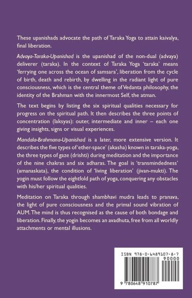 These upani¿ads advocate the path of T¿raka Yoga to attain kaivalya, final liberation. Advaya-T¿raka-Upani¿ad is the upani¿ad of the non-dual (advaya) deliverer (t¿raka). In the context of T¿raka Yoga 'taraka' means 'ferrying one across the ocean of säs¿ra', liberation from the cycle of birth, death and rebirth, by dwelling in the radiant light of pure consciousness, which is the central theme of Ved¿nta philosophy, the identity of the Brahman with the innermost Self, the ¿tman. The text begins by listing the six spiritual qualities necessary for progress on the spiritual path. It then describes the three points of concentration (laksyas), outer, intermediate and inner, each one giving insights, signs or visual experiences. Mä¿ala-Br¿hmäa-Upani¿ad is a later, more extensive version. It describes the five types of 'ether-space' (¿k¿¿a) known in t¿raka-yoga, the three types of gaze (d¿¿¿i) during meditation and the importance of the nine cakras and six ¿dh¿ras. The goal is 'transmindedness' (amanaskat¿), the condition of 'living liberation' (j¿van-mukti). The yogin must follow the eightfold path of yoga, conquering any obstacles with his spiritual qualities. Meditation on T¿raka through ¿¿mbhav¿ mudr¿ leads to präava, the light of pure consciousness and the primal sound vibration of AUM. The mind is thus recognised as the cause of both bondage and liberation. Finally the yogin becomes an avadh¿ta, free from all worldly attachments or mental illusions.