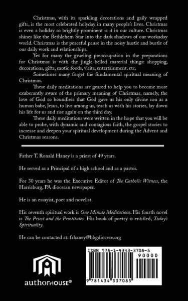 Christmas, with its sparkling decorations and gaily wrapped gifts, is the most celebrated holyday in many people's lives. Christmas is even a holiday so brightly prominent is it in our culture. Christmas shines like the Bethlehem Star into the dark shadows of our workaday world. Christmas is the peaceful pause in the noisy hustle and bustle of our daily work and relationships. Yet for many the grueling preoccupation in the preparations for Christmas is with the jingle-belled material things: shopping, decorations, gifts, exotic foods, visits, entertainment, etc. Sometimes many forget the fundamental spiritual meaning of Christmas. These daily meditations are geared to help you to become more exuberantly aware of the primary meaning of Christmas, namely, the love of God so boundless that God gave us his only divine son as a human babe, Jesus, to live among us, teach us with his stories, lay down his life for us and rise again on the third day. These daily meditations were written in the hope that you will be able to probe, with dynamic and contagious faith, the gospel stories to increase and deepen your spiritual development during the Advent and Christmas seasons.