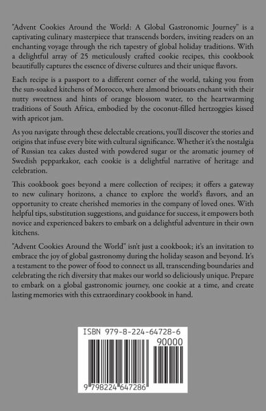 "Advent Cookies Around the World: A Global Gastronomic Journey" is a captivating culinary masterpiece that transcends borders, inviting readers on an enchanting voyage through the rich tapestry of global holiday traditions. With a delightful array of 25 meticulously crafted cookie recipes, this cookbook beautifully captures the essence of diverse cultures and their unique flavors. Each recipe is a passport to a different corner of the world, taking you from the sun-soaked kitchens of Morocco, where almond briouats enchant with their nutty sweetness and hints of orange blossom water, to the heartwarming traditions of South Africa, embodied by the coconut-filled hertzoggies kissed with apricot jam. As you navigate through these delectable creations, you'll discover the stories and origins that infuse every bite with cultural significance. Whether it's the nostalgia of Russian tea cakes dusted with powdered sugar or the aromatic journey of Swedish pepparkakor, each cookie is a delightful narrative of heritage and celebration. This cookbook goes beyond a mere collection of recipes; it offers a gateway to new culinary horizons, a chance to explore the world's flavors, and an opportunity to create cherished memories in the company of loved ones. With helpful tips, substitution suggestions, and guidance for success, it empowers both novice and experienced bakers to embark on a delightful adventure in their own kitchens. "Advent Cookies Around the World" isn't just a cookbook; it's an invitation to embrace the joy of global gastronomy during the holiday season and beyond. It's a testament to the power of food to connect us all, transcending boundaries and celebrating the rich diversity that makes our world so deliciously unique. Prepare to embark on a global gastronomic journey, one cookie at a time, and create lasting memories with this extraordinary cookbook in hand.
