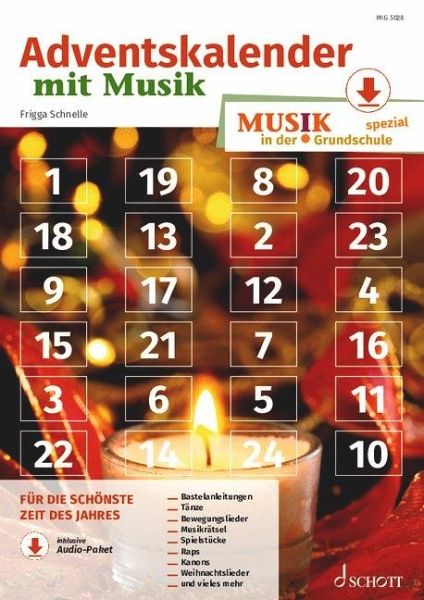 Vorneweg - Basteln und Musizieren: Adventskalenderbaum; Weihnachtsliederbuch; Triangel; Glockenarmband; Handtrommel; O Tannenbaum; Kling, Glöckchen; Engelschöre musizieren; Der Trommlerjunge - Musizier- und Mitspielsätze: Wisst ihr, was die Frösche am Weihnachtsabend machen; In der Weihnachtsbäckerei; Feliz Navidad; Ich wünsche mir zum Heiligen Christ; We wish you a Merry Christmas; Sleigh Ride - Tänze und Bewegungslieder: Oh Weihnachtsmann; Last Christmas; Wonderful Dream - Raps und Kanons: Holler boller Rumpelsack; Weihnachten (Joseph Eichendorff); Paimen laulaa; Da ist ein Leuchten in der Nacht - Singen und Raten: Weihnachtsliederrätsel; Nikolaus, Nikolaus (Puzzle-Rätsel); Ihr Kinderlein kommet (Tierkarten-Rätsel) - Heitere Spielstücke mit Musik: Weihnacht auf hoher See; Morgen kommt der Weihnachtsmann - Audio-Tracks, Autorin, ImpressumVorneweg - Basteln und Musizieren: Adventskalenderbaum; Weihnachtsliederbuch; Triangel; Glockenarmband; Handtrommel; O Tannenbaum; Kling, Glöckchen; Engelschöre musizieren; Der Trommlerjunge - Musizier- und Mitspielsätze: Wisst ihr, was die Frösche am Weihnachtsabend machen; In der Weihnachtsbäckerei; Feliz Navidad; Ich wünsche mir zum Heiligen Christ; We wish you a Merry Christmas; Sleigh Ride - Tänze und Bewegungslieder: Oh Weihnachtsmann; Last Christmas; Wonderful Dream - Raps und Kanons: Holler boller Rumpelsack; Weihnachten (Joseph Eichendorff); Paimen laulaa; Da ist ein Leuchten in der Nacht - Singen und Raten: Weihnachtsliederrätsel; Nikolaus, Nikolaus (Puzzle-Rätsel); Ihr Kinderlein kommet (Tierkarten-Rätsel) - Heitere Spielstücke mit Musik: Weihnacht auf hoher See; Morgen kommt der Weihnachtsmann - Audio-Tracks, Autorin, Impressum