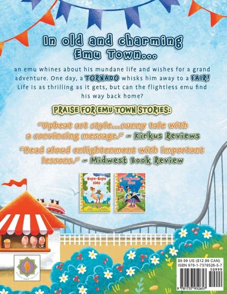 Fasten your seatbelts for a tornado, fair and thrilling adventure! In old and charming Emu Town, an emu whines about his mundane life and wishes for a grand adventure. One day, a tornado whisks him away to a fair! Life is as thrilling as it gets, but can the flightless emu find his way back home? With colorful illustrations and playful rhymes, this endearing tale with a message of gratitude is sure to delight and entertain young readers! Perfect for thanksgiving and holiday gifting, read aloud, bedtime and classroom discussions. What readers are saying about Adventure Emu: ¿¿¿¿¿ - "This teaches gratitude in a fun and non obvious way that kids and adults will love!" - JL ¿¿¿¿¿ -"This is the perfect story! Every kid wishes that if things could only be different, but happiness is best when it is served right in front of you...with a bit of kale and romaine!" - Diamond ¿¿¿¿¿ -"My kids love it. Ideal for bedtime reading!" - Jessica S. Other books in EMU TOWN STORIES:Nope-Nope Emu Magician Emu GRAB YOUR COPY TODAY!