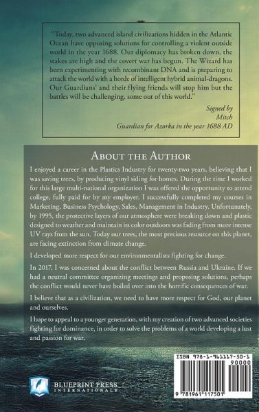 ''Today, two advanced island civilizations hidden in the Atlantic Ocean have opposing solutions for controlling a violent outside world in the year 1688. Our diplomacy has broken down, the stakes are high and the covert war has begun. The Wizard has been experimenting with recombinant DNA and is preparing to attack the world with a horde of intelligent hybrid animal-dragons. Our Guardians' and their flying friends will stop him but the battles will be challenging, some out of this world.''Signed byMitchGuardian for Azorka in the year 1688 AD I enjoyed a career in the Plastics Industry for twenty-two years, believing that I was saving trees, by producing vinyl siding for homes. During the time I worked for this large multi-national organization I was offered the opportunity to attend college, fully paid for by my employer. I successfully completed my courses in Marketing, Business Psychology, Sales, Management in Industry. Unfortunately, by 1995, the protective layers of our atmosphere were breaking down and plastic designed to weather and maintain its color outdoors was fading from more intense UV rays from the sun. Today our trees, the most precious resource on this planet, are facing extinction from climate change. I developed more respect for our environmentalists fighting for change. In 2017, I was concerned about the conflict between Russia and Ukraine. If we had a neutral committee organizing meetings and proposing solutions, perhaps the conflict would never have boiled over into the horrific consequences of war. I believe that as a civilization, we need to have more respect for God, our planet and ourselves. I hope to appeal to a younger generation, with my creation of two advanced societies fighting for dominance, in order to solve the problems of a world developing a lust and passion for war.