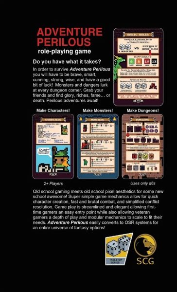 Do you have what it takes to survive Adventure Perilous? To do so, you will need to be brave, smart, cunning, strong, wise, and a good bit of luck wouldn't hurt, either. You see, monsters and dangers lurk at every dungeon door. Grab your friends, and your dice, and get ready because glory, riches and fame await you, if you're successful, and death awaits if you're not. Go now adventurer, seek your gold. Perilous adventures await! Adventure Perilous is a fantasy, rules-lite tabletop rpg that blends an 8-bit aesthetic with an easy-to-learn two six-sided dice system that allows for fast action and simple play. Adventure Perilous focuses on fast gameplay by keeping game mechanics simple and streamlined. The Game Master (the person running the game) rarely needs to reference the rules once learned. This creates a style of play that keeps players immersed in the events of the game as the action in game is paramount and the rules recede into the background. Bookkeeping is minimal thanks to easy math and simple character sheets.