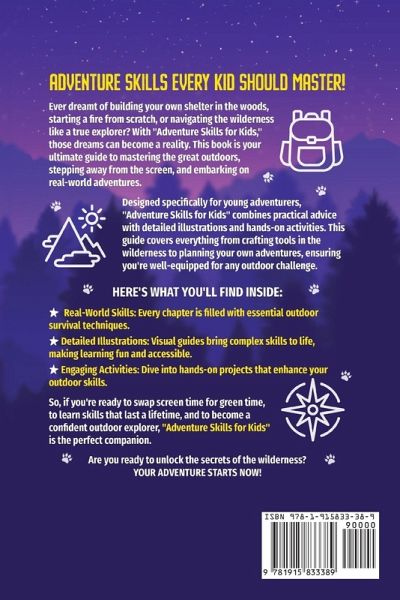SCREEN-FREE ADVENTURE SKILLS EVERY KID SHOULD MASTER! In today's digital age, it is more important than ever to encourage kids to step away from screens and immerse themselves in the great outdoors. "Adventure Skills for Kids" is a passport to a world of outdoor adventure and essential wilderness survival skills, all presented in a fun, engaging way that's just right for young explorers. This book isn't just about learning the basics; it's a hands-on guide to exploring the wild. Ideal for children nine and older, it ignites a spirit of adventure, teaches invaluable skills beyond the screen, enriches their understanding of the world, and fosters a deep respect for nature. Inside "Adventure Skills for Kids," discover: Step-by-Step Shelter Building: Master creating shelters, from simple lean-tos to complex structures. Fire Making: Learn safe, practical techniques for starting and maintaining fires. Navigation Skills: Use traditional compasses and maps or navigate by the stars and natural landmarks. Essential Wilderness Survival Skills: Gain critical knowledge in finding and purifying water and emergency preparedness. Screen-Free Adventures: Boost independence, confidence, and creativity away from electronic devices. Whether for a backyard campout or a wilderness expedition, "Adventure Skills for Kids" provides the knowledge needed to tackle the outdoors confidently. Readers will finish the book prepared to explore the wilderness and gain a profound appreciation for the natural world. This book is an excellent resource for anyone looking to inspire children's love of outdoor adventure. It's about thriving in nature and creating memories that last a lifetime. Grab your copy today and inspire a new generation of adventurers!
