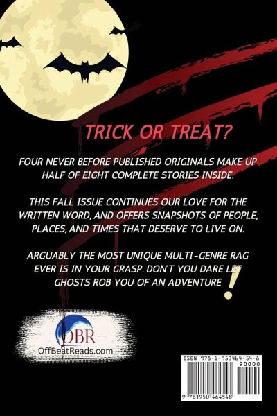 Four never before published originals make up half of eight complete stories inside. This fall issue continues our love for the written word, and offers snapshots of people, places, and times that deserve to live on. Arguably the most unique multi-genre rag ever is in your grasp. Don't you dare let ghosts rob you of an adventure!