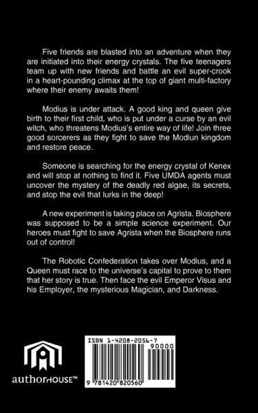 Five friends are blasted into an adventure when they are initiated into their energy crystals. The five teenagers team up with new friends and battle an evil super-crook in a heart-pounding climax at the top of giant multi-factory where their enemy awaits them! Modius is under attack. A good king and queen give birth to their first child, who is put under a curse by an evil witch, who threatens Modius's entire way of life! Join three good sorcerers as they fight to save the Modiun kingdom and restore peace. Someone is searching for the energy crystal of Kenex and will stop at nothing to find it. Five UMDA agents must uncover the mystery of the deadly red algae, its secrets, and stop the evil that lurks in the deep! A new experiment is taking place on Agrista. Biosphere was supposed to be a simple science experiment. Our heroes must fight to save Agrista when the Biosphere runs out of control! The Robotic Confederation takes over Modius, and a Queen must race to the universe's capital to prove to them that her story is true. Then face the evil Emperor Visus and his Employer, the mysterious Magician, and Darkness. Interested readers can find out more by visiting www.adventuresacrosstheuniverse.com.