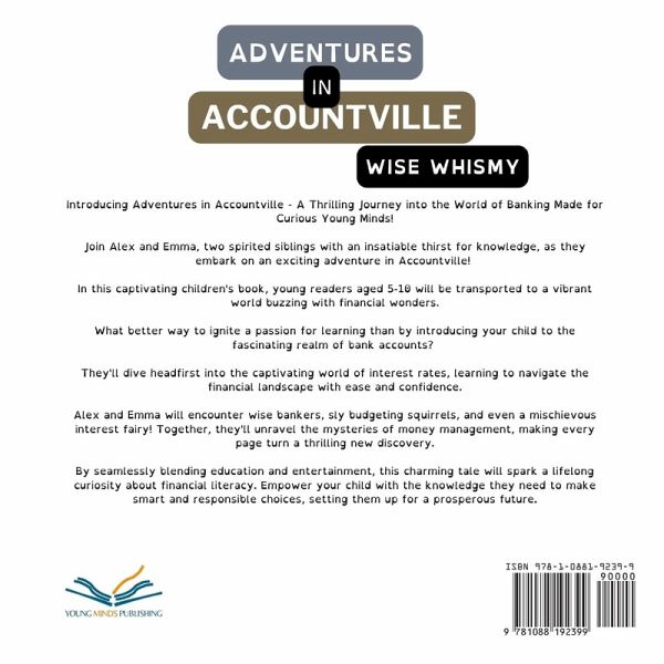 Introducing Adventures in Accountville - A Thrilling Journey into the World of Banking Made for Curious Young Minds! Join Alex and Emma, two spirited siblings with an insatiable thirst for knowledge, as they embark on an exciting adventure in Accountville! In this captivating children's book, young readers aged 5-10 will be transported to a vibrant world buzzing with financial wonders. What better way to ignite a passion for learning than by introducing your child to the fascinating realm of bank accounts? In this enchanting tale, Alex and Emma will unlock the secrets behind savings, checking, and certificates of deposit. They'll dive headfirst into the captivating world of interest rates, learning to navigate the financial landscape with ease and confidence. But this story is more than just an educational journey - it's an epic adventure full of heartwarming moments and unforgettable characters. Alex and Emma will encounter wise bankers, sly budgeting squirrels, and even a mischievous interest fairy! Together, they'll unravel the mysteries of money management, making every page turn a thrilling new discovery. Adventures in Accountville is not just a book, it's a transformative tool that equips young minds with essential life skills. By seamlessly blending education and entertainment, this charming tale will spark a lifelong curiosity about financial literacy. Empower your child with the knowledge they need to make smart and responsible choices, setting them up for a prosperous future. As a parent, you'll be delighted to see your child captivated by the vivid illustrations that bring the story to life. The brilliant colors and charming characters will ignite their imagination, making each reading session an enchanting experience. Watch as their eyes widen with excitement, eager to learn more about the mysteries of banking! So, why wait? Take your child on an exhilarating adventure through Accountville, where financial literacy becomes a thrilling quest. Prepare them for a lifetime of financial success and watch as their confidence soars. Get your hands on Adventures in Accountville today and embark on a journey that will leave a lasting impact for years to come. Don't miss out on this extraordinary opportunity to educate, inspire, and empower your child. Open the doors to a world of financial knowledge and give them the tools they need to thrive in this ever-changing landscape. Adventures in Accountville awaits, ready to be cherished by young readers everywhere.