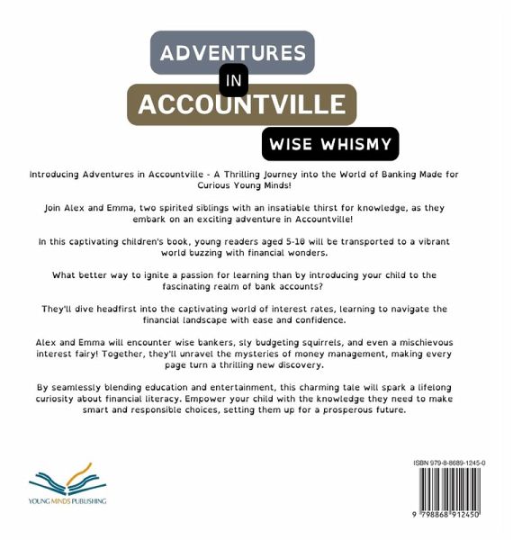 Introducing Adventures in Accountville - A Thrilling Journey into the World of Banking Made for Curious Young Minds! Join Alex and Emma, two spirited siblings with an insatiable thirst for knowledge, as they embark on an exciting adventure in Accountville! In this captivating children's book, young readers aged 5-10 will be transported to a vibrant world buzzing with financial wonders. What better way to ignite a passion for learning than by introducing your child to the fascinating realm of bank accounts? In this enchanting tale, Alex and Emma will unlock the secrets behind savings, checking, and certificates of deposit. They'll dive headfirst into the captivating world of interest rates, learning to navigate the financial landscape with ease and confidence. But this story is more than just an educational journey - it's an epic adventure full of heartwarming moments and unforgettable characters. Alex and Emma will encounter wise bankers, sly budgeting squirrels, and even a mischievous interest fairy! Together, they'll unravel the mysteries of money management, making every page turn a thrilling new discovery. Adventures in Accountville is not just a book, it's a transformative tool that equips young minds with essential life skills. By seamlessly blending education and entertainment, this charming tale will spark a lifelong curiosity about financial literacy. Empower your child with the knowledge they need to make smart and responsible choices, setting them up for a prosperous future. As a parent, you'll be delighted to see your child captivated by the vivid illustrations that bring the story to life. The brilliant colors and charming characters will ignite their imagination, making each reading session an enchanting experience. Watch as their eyes widen with excitement, eager to learn more about the mysteries of banking! So, why wait? Take your child on an exhilarating adventure through Accountville, where financial literacy becomes a thrilling quest. Prepare them for a lifetime of financial success and watch as their confidence soars. Get your hands on Adventures in Accountville today and embark on a journey that will leave a lasting impact for years to come. Don't miss out on this extraordinary opportunity to educate, inspire, and empower your child. Open the doors to a world of financial knowledge and give them the tools they need to thrive in this ever-changing landscape. Adventures in Accountville awaits, ready to be cherished by young readers everywhere.