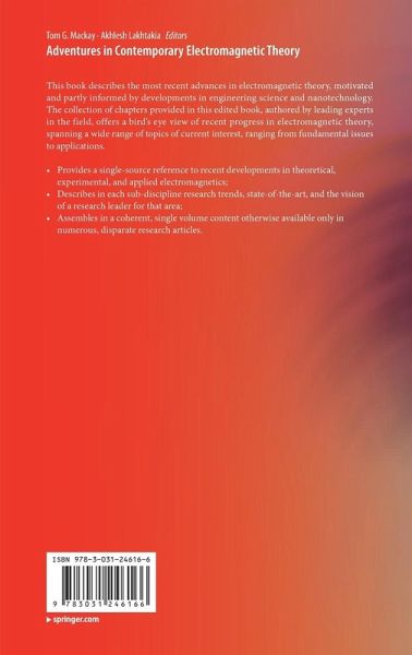 This book describes the most recent advances in electromagnetic theory, motivated and partly informed by developments in engineering science and nanotechnology. The collection of chapters provided in this edited book, authored by leading experts in the field, offers a bird's eye view of recent progress in electromagnetic theory, spanning a wide range of topics of current interest, ranging from fundamental issues to applications.