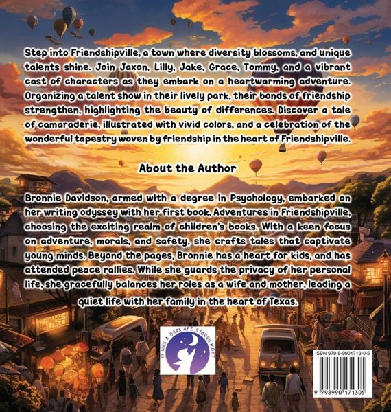 Step into Friendshipville, a town where diversity blossoms, and unique talents shine. Join Jaxon, Lilly, Jake, Grace, Tommy, and a vibrant cast of characters as they embark on a heartwarming adventure. Organizing a talent show in their lively park, their bonds of friendship strengthen, highlighting the beauty of differences. Discover a tale of camaraderie, illustrated with vivid colors, and a celebration of the wonderful tapestry woven by friendship in the heart of Friendshipville.