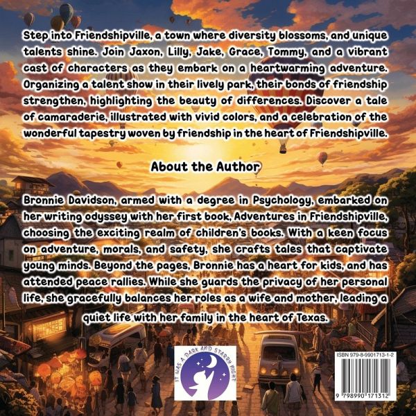 Step into Friendshipville, a town where diversity blossoms, and unique talents shine. Join Jaxon, Lilly, Jake, Grace, Tommy, and a vibrant cast of characters as they embark on a heartwarming adventure. Organizing a talent show in their lively park, their bonds of friendship strengthen, highlighting the beauty of differences. Discover a tale of camaraderie, illustrated with vivid colors, and a celebration of the wonderful tapestry woven by friendship in the heart of Friendshipville.